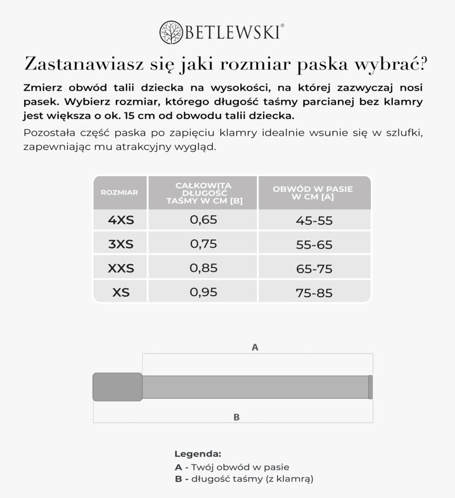 Pasek parciany CASUAL SLIM BETLEWSKI® dla dzieci z klamrą, na której wykonujemy grawer imienia, to wygodny i praktyczny dodatek dla najmłodszych. Personalizowana klamra sprawia, że pasek staje się wyjątkowy, a do tego pomaga łatwo rozpoznać go w przedszkolu, szkole czy na wyjazdach. Wykonany został z wysokiej jakości parcianej taśmy polipropylenowej, dzięki czemu jest bardzo wytrzymały.