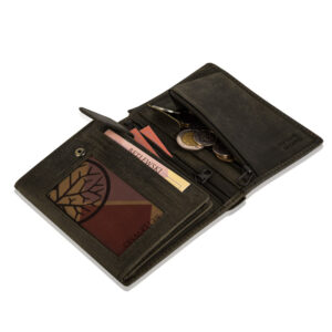 – zamykaną na suwak kieszeń na monety i dodatkowa na zgięciu portfela,