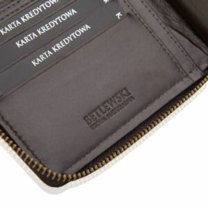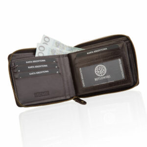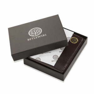 Na froncie portfela znajduje się wytłoczone drzewko – metalowe logo marki BETLEWSKI® w kolorze antycznego złota. Na produkcie znajdziesz liczne detale potwierdzające oryginalność produktu, takie jak: oryginalne wkładki kartonowe czy tłoczenia w skórze. Dodatkowo do produktu dołączany jest certyfikat autentyczności.