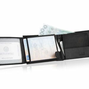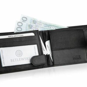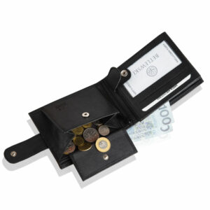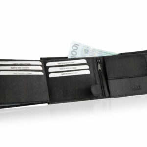 Po prawej stronie znajduje się zamykana na zatrzask kieszonka na monety, której przednia i tylna część w całości wykonane są ze skóry naturalnej, która zapewni jej większą elastyczność. Na zgięciu portfela umieściliśmy schowek – kieszonkę na suwak, w której przechowasz małe przedmioty, które z pewnością będą w tym miejscu najbardziej bezpieczne. Na szczycie portfela znajdziesz 2 przegrody na banknoty lub rachunki wyściełane są sztywną podszewką w ciemnym kolorze, która pozwoli na ich organizację bez nieestetycznych zgnieceń czy uszkodzeń.