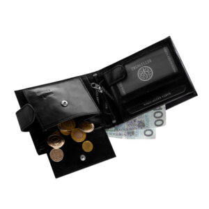 Pierwsza, główna sekcja, w której zaraz po otwarciu, po lewej stronie znajdziesz miejsce na kartę kredytową i 1 przezroczystą przegródkę, w której zmieścisz np. dowód osobisty lub znajdziesz miejsce na zdjęcie Twoich bliskich. Po prawej stronie znajduje się zamykana na zatrzask kieszonka na monety, której przednia i tylna część w całości wykonane są ze skóry naturalnej, która zapewni jej większą elastyczność. Na zgięciu portfela umieściliśmy schowek – kieszonkę na suwak, w której zabezpieczysz małe przedmioty, które z pewnością będą w tym miejscu najbardziej bezpieczne.