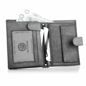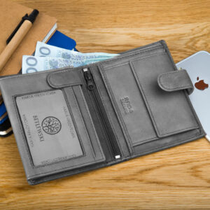 Zamykany na zatrzask portfel męski to świetny sposób na odpowiednie zabezpieczenie niezbędnych drobiazgów. Podzielony jest na specjalne sekcje, w których znajdziesz idealne miejsce na dokumenty, pieniądze i karty płatnicze.