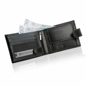 Bydlęca skóra naturalna, z której wykonany jest portfel, jest niezwykle wytrzymała i z upływem czasu pięknie się starzeje. Skórzany portfel męski to produkt z klasą. Metalowe logo marki BETLEWSKI® umieszczone na jego froncie i lekko połyskujące wykończenie nadają mu niezwykły charakter.