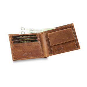 Portfel męski MATTHEW został wyposażony w przegródki i kieszonki, które mimo niewielkich rozmiarów portfela pomieszczą wszystkie najważniejsze dokumenty. Portfel ma miejsce na gotówkę, banknoty i dokumenty. Jego wymiary pozwolą Ci na noszenie go w kieszeni spodni lub kurtki.