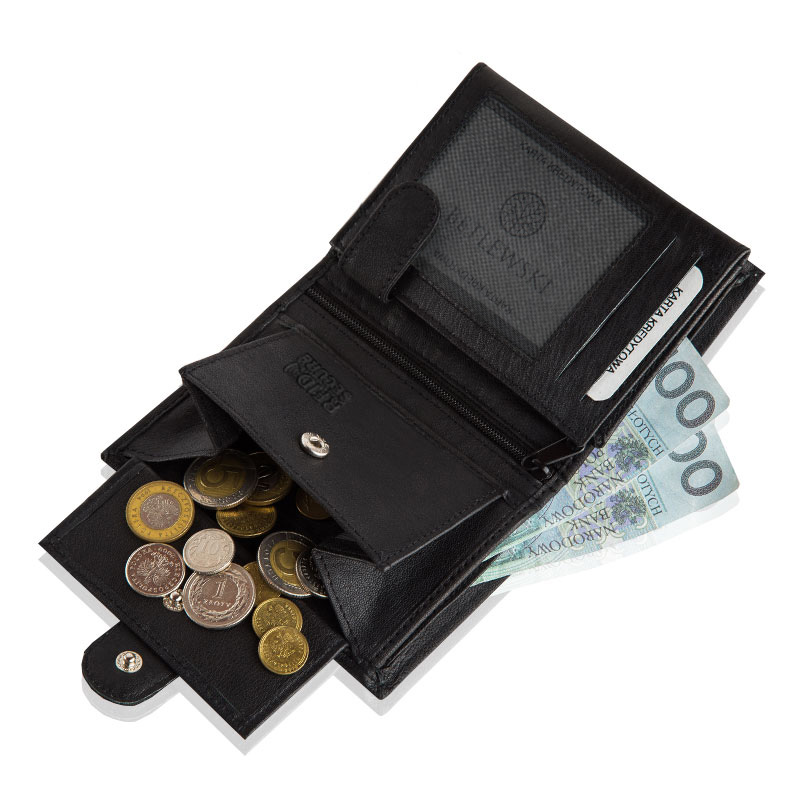 Portfel z kolekcji OPTIMAL jest bardzo pojemny, a przy tym poręczny i wygodny. Posiada aż 12 kieszonek i przegródek. Z łatwością pomieści wszystkie potrzebne karty oraz dowód rejestracyjny bez okładki. 2 otwarte kieszenie znajdują się za sekcją dokumenty oraz kieszenią na bilon. W centralnej części znajduje się natomiast schowek zamykany na suwak. W portfelu zastosowano technologię RFID – dzięki specjalnej membranie, blokującej nieautoryzowane skanowanie kart zbliżeniowych możesz mieć pewność, że Twoje pieniądze będą bezpieczne.