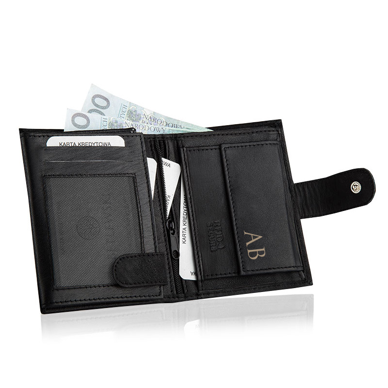 Grawerowany, skórzany portfel z kolekcji OPTIMAL BETLEWSKI® niezwykle elegancki dodatek, który z powodzeniem możesz podarować w prezencie. Grawer wykonujemy techniką laserową, więc jest niezwykle dokładny i trwały. Czerń nigdy nie wychodzi z mody, zaś ponadczasowy fason sprawia, że portfel będzie odpowiedni dla panów w każdym wieku. Zastosowane zapięcie na froncie portfela zapewnia, że jego zawartość jest dobrze chroniona. Portfel został wykonany z wytrzymałej skóry naturalnej, koziej. Skóra ta charakteryzuje się wyjątkową szlachetnością i miękkością, a także delikatną, groszkową fakturą. W dotyku portfel jest niezwykle przyjemny. Mięciutka skóra sprawia, że użytkowanie portfela staje się niezwykłym doznaniem, sprawdź!