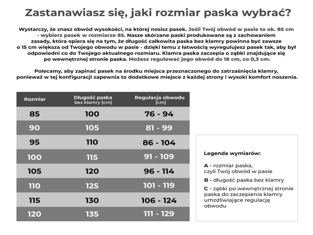 Jak wybrać rozmiar paska na podstawie rozmiaru spodni? Często spodnie mają swoją standardową tabelę rozmiarów, która odpowiada konkretnemu obwodowi w pasie. Sprawdź rozmiar swoich spodni, a następnie zweryfikuj w tabeli rozmiarów, jakiej długości obwodu w pasie odpowiada. Pamiętaj, że jeśli, np. nosisz spodnie w rozmiarze 32, to odpowiada on +/- długości 82 cm. Warto wtedy wybrać pasek o kilka centymetrów większy, czyli odpowiadający długości 90.