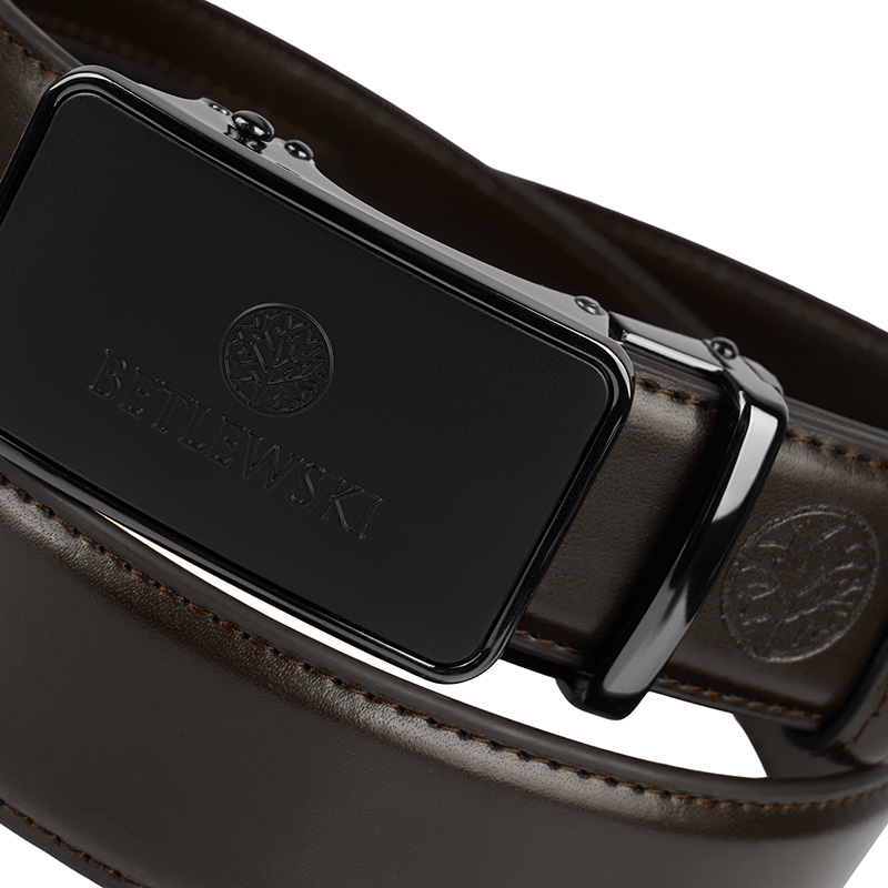 Ciemnobrązowy pasek ELITE BETLEWSKI® z klamrą o szerokości 37 mm to połączenie ponadczasowej elegancji z nowoczesnym designem. Centralnie umieszczone logo BETLEWSKI® podkreśla luksusowy charakter produktu, a delikatny połysk automatycznej klamry dodaje mu klasy.