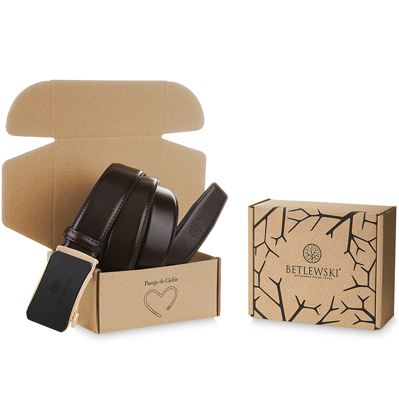 Każdy pasek BETLEWSKI® zapakowany jest w eleganckie pudełko firmowe, dzięki czemu świetnie sprawdzi się jako prezent dla mężczyzny z klasą. Złota klamra dodaje mu wyjątkowego, luksusowego charakteru.