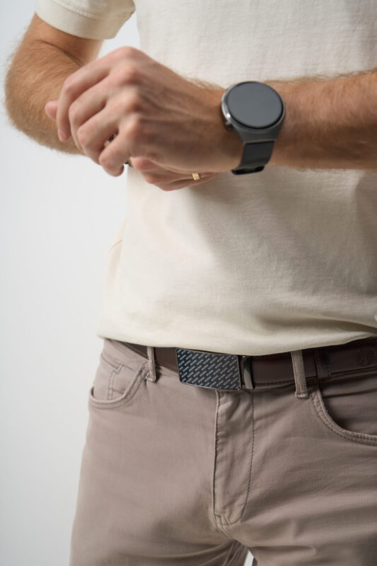 Wystarczy, że wsuniesz pasek w szlufki, a później jego końcówkę w klamrę i przeciągniesz zapadkę. Klamra paska automatycznie zablokuje go na wysokości, na której nosisz pasek – to niezwykle prosty i szybki sposób na odpinanie i zapinanie paska! Nieważne czy siedzisz, stoisz lub kucasz, konstrukcja paska zapewnia, że będzie wygodne się trzymał.