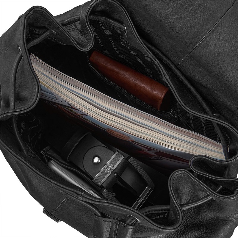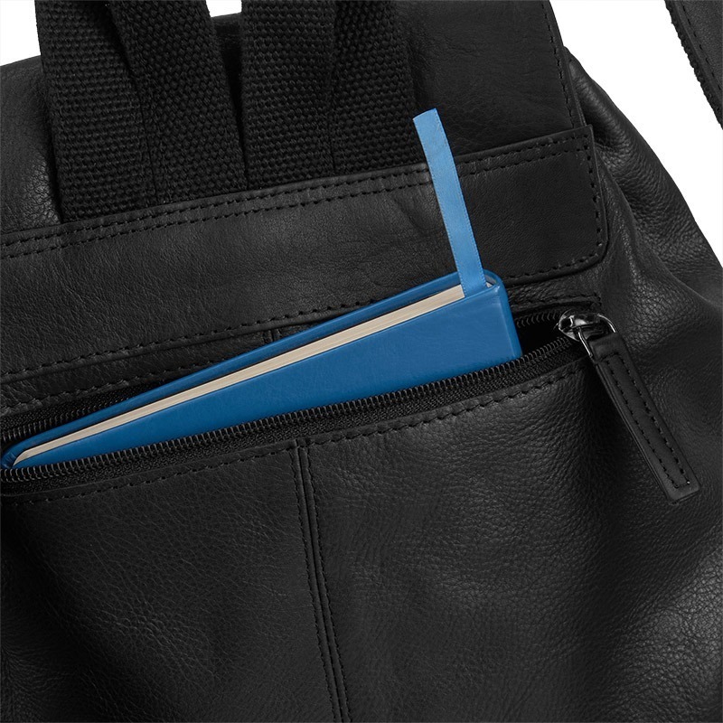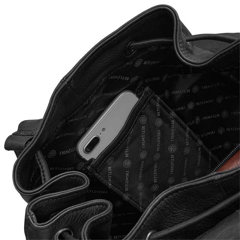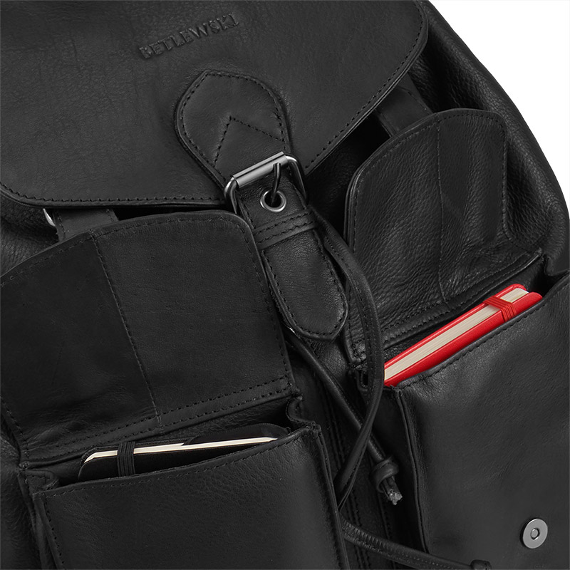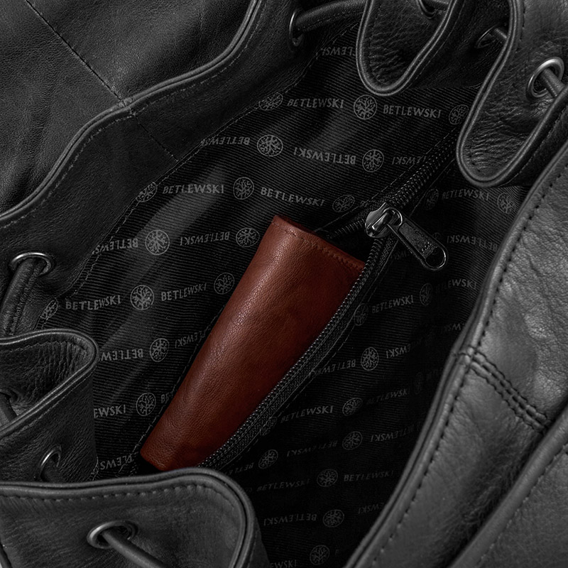 Plecak CAMBRIDGE BETLEWSKI® oferuje jedną główną komorę, która bez trudu mieści dokumenty w formacie A4, co czyni go idealnym wyborem do pracy czy na uczelnię. Wewnątrz głównej komory znajduje się płaska kieszeń na suwak oraz otwarta kieszeń, idealna na telefon lub inne drobiazgi. Dodatkowo, plecak posiada pięć kieszeni: jedną płaską kieszeń na suwak z tyłu, dwie mniejsze kieszenie zapinane na klipsy, ukryte pod klapą z przodu, oraz dwie wewnętrzne kieszenie, które pozwalają na przechowywanie niezbędnych przedmiotów w sposób uporządkowany i łatwo dostępny.