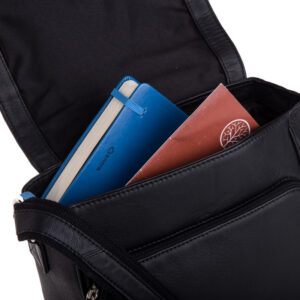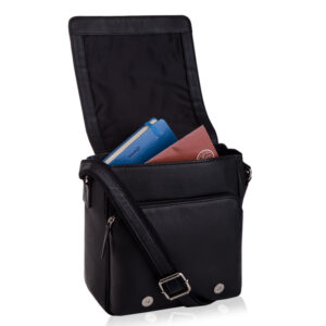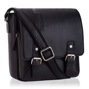 Listonoszka zamykana jest klapą na 2 magnetyczne klipsy, ozdobione skórzanymi paskami z klamerkami w kolorze srebra, tworząc nowoczesny i stylowy element. Pod klapą mieści się mniejsza kieszeń zamykana na suwak, idealna na drobiazgi o wymiarach wewnętrznych 21 cm x 18 cm x 4 cm.