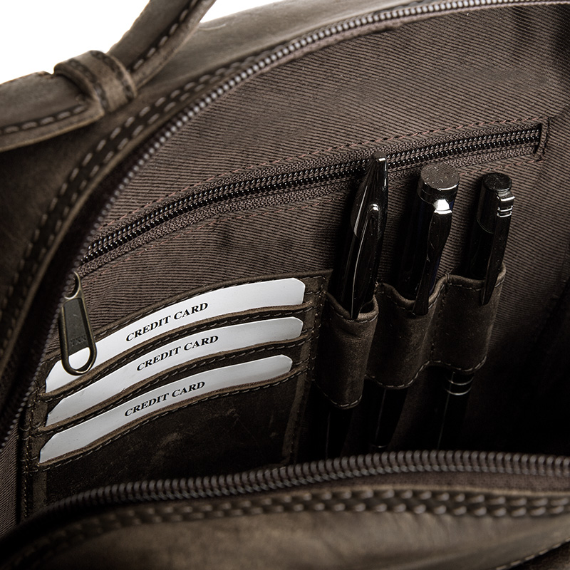 Torba została wykonana z nubukowej skóry naturalnej o wysokiej jakości, wykończona z dbałością o najmniejsze detale. Na froncie torby znajdują się: