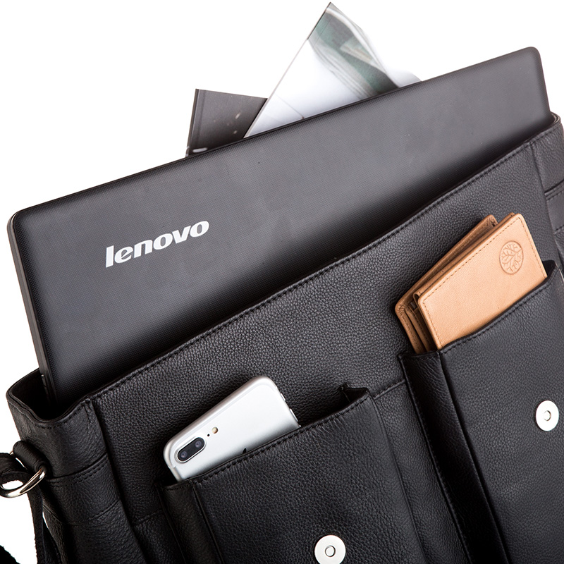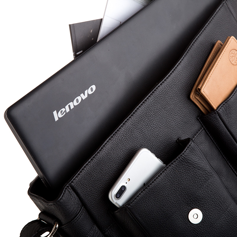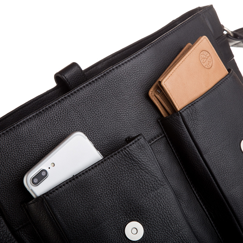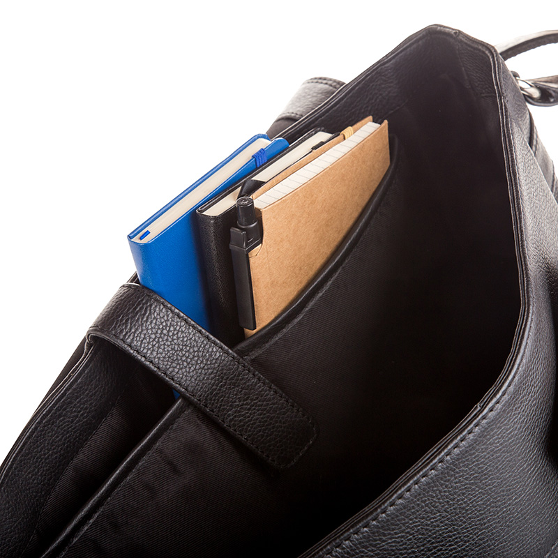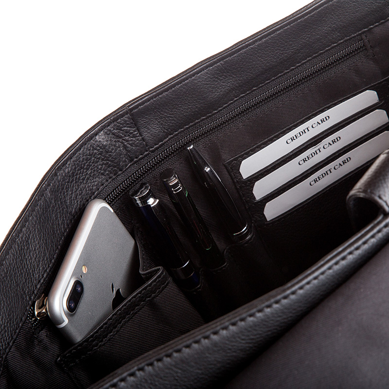 Zaraz pod klapą znajdują się 2 głębokie, otwarte kieszenie, idealne na przechowywanie telefonu, małego tabletu czy notesów. Kieszenie te są nie tylko praktyczne, ale również stylowe, stanowiąc dopełnienie eleganckiego designu teczki. Wnętrze teczki pełne jest funkcjonalności. Duża komora bez trudu pomieści laptopa o rozmiarze 15,6″. Dodatkowo, mniejsza otwarta kieszeń zamykana paskiem na rzep to doskonałe miejsce na przechowywanie mniejszych przedmiotów, które chcesz mieć zawsze pod ręką.
