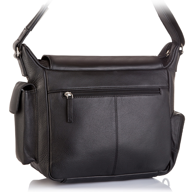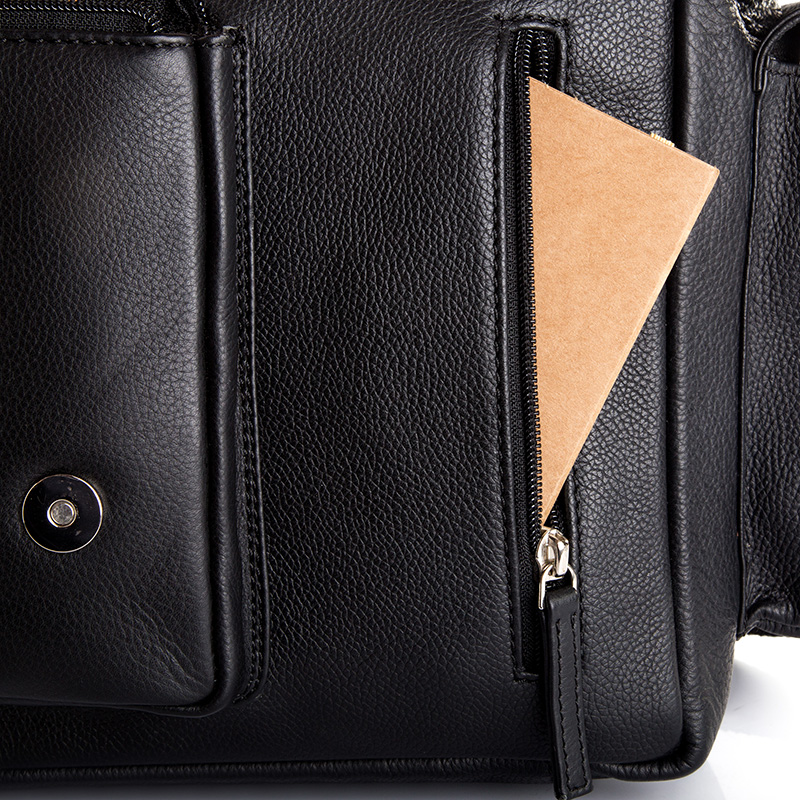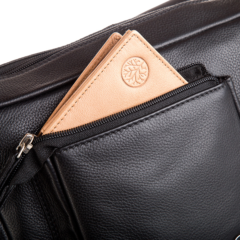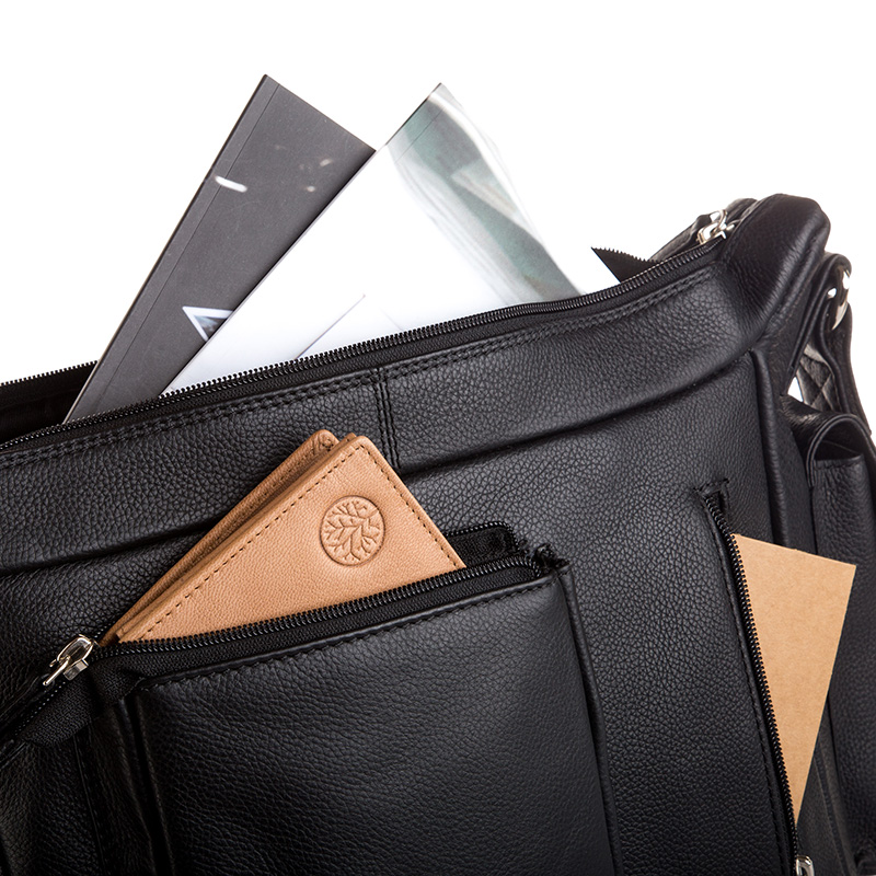 Zarówno z prawej, jak i lewej strony torby znajdują się dodatkowe kieszonki, idealne na różnego rodzaju drobiazgi. Z pionową kieszenią na pióra i długopisy po jednej stronie, a z drugiej – sporą kieszenią na suwak z obręczami w kolorze antycznego złota, pozwalającymi na przypięcie breloka czy kluczy.
