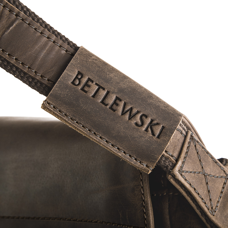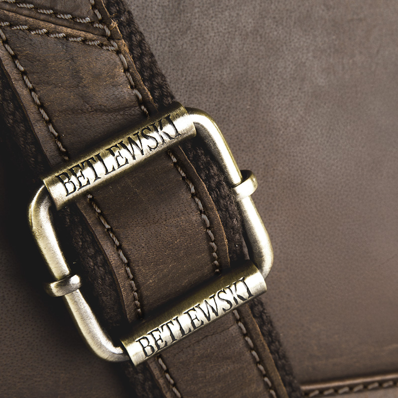 Wykonana ze skóry naturalnej o wysokiej jakości, wytrzymałego nubuku i wykończona z dbałością o najmniejsze detale. Nubuk charakteryzuje się również nieregularnymi przetarciami oraz barwą. O nubuku mówi się, że “pięknie się starzeje”. Potwierdzamy! Z wiekiem torba nabierze jeszcze bardziej wyjątkowego charakteru. Na froncie torby znajduje się wytłoczone logo marki Betlewski®. Wybierając ją będziesz właścicielem nie tylko markowego, ale i modnego oraz unikalnego dodatku. Wyróżnij się z tłumu! Na produkcie znajdziemy liczne detale potwierdzające oryginalność produktu takie jak: metki, tłoczenia w skórze oraz znakowania na metalowych elementach. Dodatkowo do produktu dołączany jest certyfikat, potwierdzający materiał i jakość wykonania torby. Torba zamykana jest klapą na 2 magnetyczne klipsy. Na klapie znajduje się kieszeń na suwak ładnie schowany pod zakładką ze skóry. Torba posiada 1 dużą komorę przegrodzoną wzmocnioną ścianką z pianki. Kieszeń ta z powodzeniem zmieści laptopa 15,6″. W torbie znajdują się: