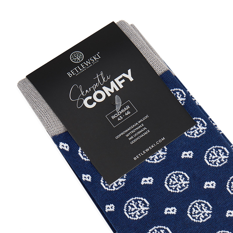Sięgając po zestaw 3 par wzorzystych skarpetek COMFY BETLEWSKI®, zyskujesz połączenie komfortu, wysokiej jakości i drobnego motywu z logo marki, który wyróżnia każdą stylizację. Wykonane w 73% z bawełny z dodatkiem poliamidu i elastanu, są miękkie, przewiewne i elastyczne, dzięki czemu doskonale dopasowują się do stopy. Oddychająca tkanina odprowadza wilgoć i dba o świeżość nawet podczas całodniowego noszenia, a staranne wykończenie sprawia, że skarpetki zachowują swój wygląd po wielu praniach. Bezuciskowy, dobrze przylegający ściągacz utrzymuje je na miejscu i sprawia, że zawsze prezentują się elegancko.