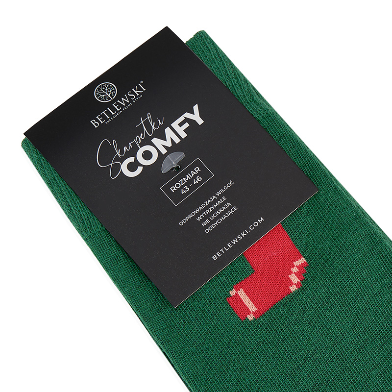 Skarpetki świąteczne COMFY BETLEWSKI® to akcent, który wprowadza odrobinę radości w chłodne, zimowe dni. Wykonane z miękkiej, naturalnej bawełny, zapewniają przewiewność oraz przyjemny komfort noszenia. Dodatek poliamidu i elastanu sprawia, że idealnie dopasowują się do stopy, nie powodując ucisku, a przy tym zachowują swój fason nawet po wielu praniach. Szeroki, elastyczny ściągacz utrzymuje je na miejscu, dając swobodę ruchów.