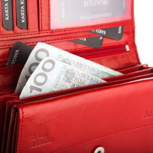Pojemność naszego portfela zadziwia niejedną, zadowoloną klientkę! W jego wnętrzu znajdziesz także wiele mniejszych przegródek i schowków, które jak wiadomo, przydadzą się każdej kobiecie. Jeśli nosisz ze sobą gotówkę to znajdziesz miejsce i dla niej – w sekcji na pieniądze umieszczone są 4 szerokie kieszenie, które są wprost stworzone na banknoty lub rachunki.
