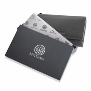 Opakowanie jest dla nas równie ważne, jak i zawartość, dlatego portfel został owinięty w delikatny papier i starannie zapakowany w eleganckie pudełko z logo marki BETLEWSKI®.