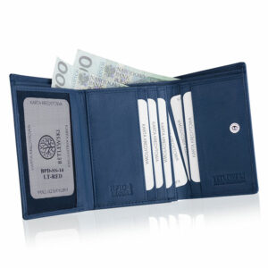 Mniejszy portfel z ochroną RFID nie pozostawia wiele miejsca na zbędne rzeczy. Ma kilka miejsc karty, które są wystarczająco duże, aby pomieścić codzienną kartę płatniczą, dowód osobisty lub ważny rachunek. Dzieli się na przyjemne sekcje – zapinaną na bigiel i zatrzask – główna – portmonetka z miejscem na monety i wewnętrzna z miejscem na karty, dokumenty oraz banknoty.