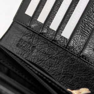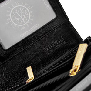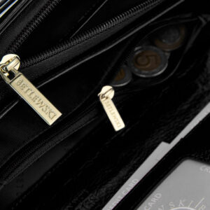 Chcesz mieć duży portfel, który wreszcie pomieści wszystkie karty, dokumenty i pieniądze? Wysokiej jakości modny portfel damski BETLEWSKI®, to model, który zaprojektowaliśmy z dbałością o każdy detal. Jego zewnętrzna strona pokryta jest lakierowaną, naturalną skórą licową, która nadaje mu wspaniały, oryginalny efekt. Wykonany z myślą o bezpieczeństwie, czarny portfel damski wyposażony jest w zaawansowaną technologię RFID Secure, która chroni Twoje karty przed nieautoryzowanym skanowaniem.