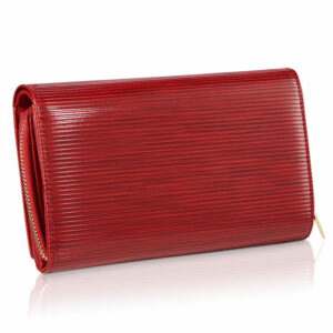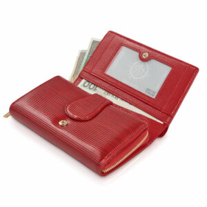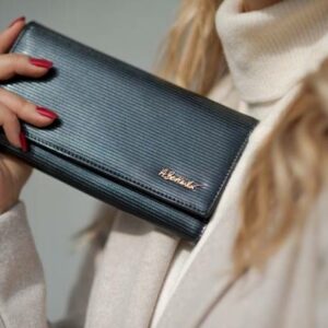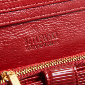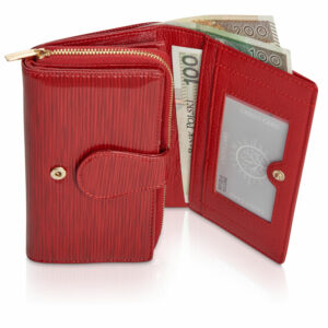 Ten wyjątkowo elegancki skórzany portfel damski został zaprojektowany przez nas z myślą o kobietach, które na co dzień noszą ze sobą dużą ilość kart, a przy tym cenią sobie praktyczne akcesoria. W jego wnętrzu znajdziesz specjalną, odseparowaną sekcję z miejscem na aż 12 kart, co w porównaniu do wielkości portfela przestawia się naprawdę imponująco! Prócz tego, portfel pomieści w swoim rozbudowanym wnętrzu banknoty, monety, a nawet dowód rejestracyjny. Zewnętrzne pokrycie wykonane jest z lakierowanej bydlęcej skóry naturalnej z paskowym wzorem, a wnętrze pokrywa matowa skóra licowa w tym samym kolorze oraz podszewki z logo marki. Między tymi warstwami skóry umieszczono specjalną, niewidoczną i ultra lekką membranę, która stanowi system zabezpieczający (RFID Secure) przed nieautoryzowanym skanowaniem kart znajdujących się we wnętrzu zamkniętego portfela.