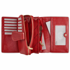 – przezroczystej przegródki z miejscem na zdjęcia lub dokument ze zdjęciem – pod nią znajdziesz jeszcze skrytkę na całej szerokości portfela.
