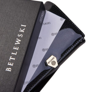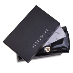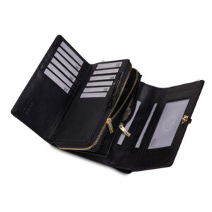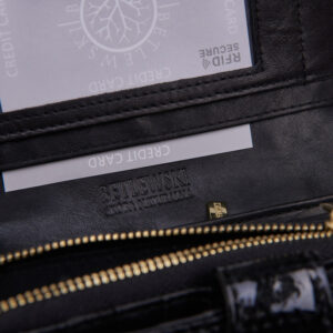 Ten wyjątkowo elegancki skórzany portfel damski został zaprojektowany przez nas z myślą o kobietach, które na co dzień noszą ze sobą dużą ilość kart, a przy tym cenią sobie praktyczne akcesoria. W jego wnętrzu znajdziesz specjalną, odseparowaną sekcję z miejscem na aż 12 kart, co w porównaniu do wielkości portfela przestawia się naprawdę imponująco! Prócz tego, portfel pomieści w swoim rozbudowanym wnętrzu banknoty, monety, a nawet dowód rejestracyjny. Zewnętrzne pokrycie wykonane jest z bydlęcej skóry naturalnej z wzorem, a wnętrze pokrywa matowa skóra licowa w tym samym kolorze oraz podszewki z logo marki. Między tymi warstwami skóry umieszczono specjalną, niewidoczną i ultra lekką membranę, która stanowi system zabezpieczający (RFID Secure) przed nieautoryzowanym skanowaniem kart znajdujących się we wnętrzu zamkniętego portfela.