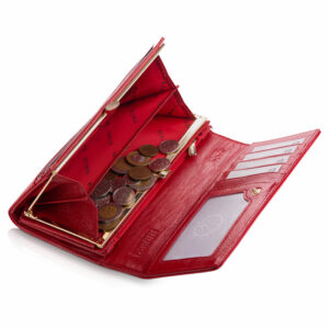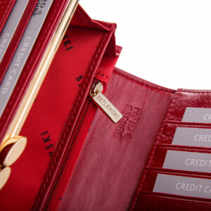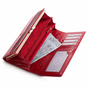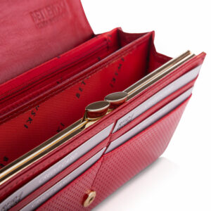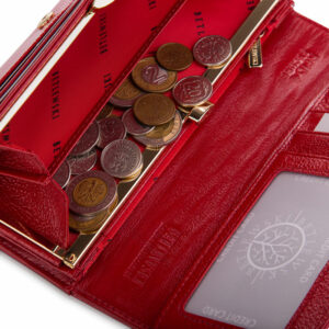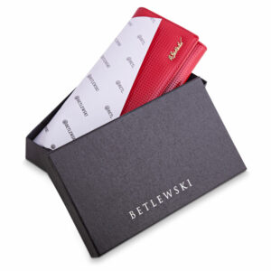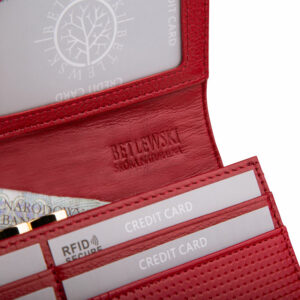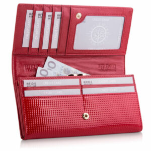 Chcesz mieć duży portfel, który wreszcie pomieści wszystkie karty, dokumenty i pieniądze? Wysokiej jakości modny portfel damski Betlewski®, to model, który zaprojektowaliśmy z dbałością o każdy detal. Jego zewnętrzna strona pokryta jest lakierowaną, naturalną skórą licową o kropkowanej fakturze, która nadaje mu wspaniały, oryginalny efekt. Wykonany z myślą o bezpieczeństwie, czerwony portfel wyposażony jest w zaawansowaną technologię RFID Secure, która chroni Twoje karty przed nieautoryzowanym skanowaniem.