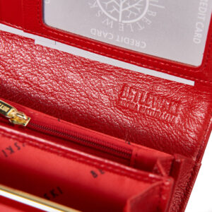 Portfel damski skórzany wykonany z lakierowanej skóry naturalnej o gładkiej strukturze. Powierzchnie materiału zdobi artystyczny motyw rozproszonych piórek. Jego struktura została wzbogacona o technologię RFID Secure, która chroni przed nieautoryzowanym skanowaniem kart płatniczych. Portfel zamyka się na zatrzask. Wszystkie metalowe elementy portfela i logo na froncie są w kolorze klasycznego złota.