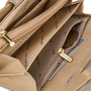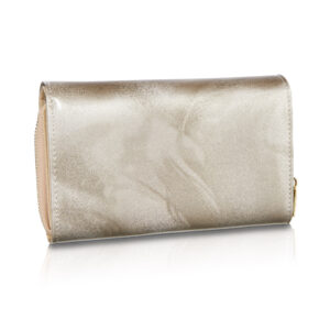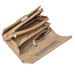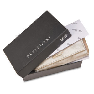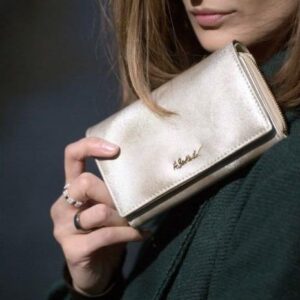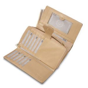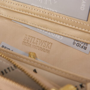 Ten wyjątkowo elegancki portfel damski został zaprojektowany z myślą o kobietach, które na co dzień noszą ze sobą dużą ilość kart. W jego wnętrzu znajdziesz specjalną, odseparowaną sekcję z miejscem na aż 12 kart. W porównaniu do wielkości portfela przestawia się naprawdę imponująco! Prócz tego, portfel damski pomieści banknoty, monety, a nawet dowód rejestracyjny. Zewnętrzne pokrycie wykonane jest z bydlęcej skóry naturalnej z wzorem. Wnętrze pokrywa matowa skóra licowa w tym samym kolorze oraz podszewki z logo marki. Między tymi dwoma warstwami skóry umieszczono specjalną, niewidoczną i ultra lekką membranę, która stanowi system zabezpieczający (RFID Secure). System chroni przed nieautoryzowanym skanowaniem kart znajdujących się we wnętrzu zamkniętego portfela.