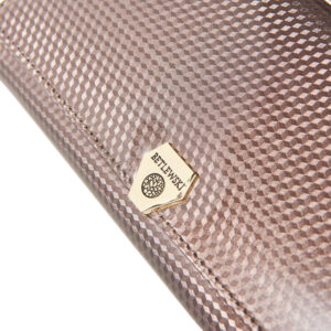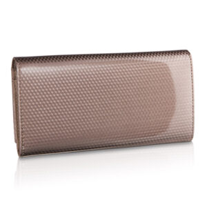 Portfel damski skórzany wykonany z lakierowanej skóry naturalnej o gładkiej strukturze. Jego struktura została wzbogacona o technologię RFID Secure, która chroni przed nieautoryzowanym skanowaniem kart płatniczych. Portfel zamyka się na zatrzask i jest zapakowany w eleganckie, czarne pudełko. Wszystkie metalowe elementy portfela i logo na froncie są w kolorze klasycznego złota.