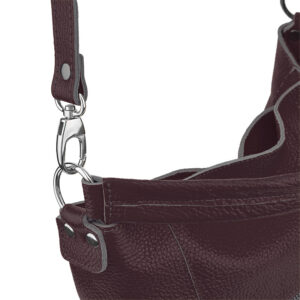 Torebka damska ROSA to produkt wykonany z włoskiej skóry naturalnej, licowej. Po bokach torby znajdują się metalowe obręcze na których zamocowane jest ucho do noszenia torby w ręce. Do metalowych kółek można również doczepić pas na ramię. Dołączony do niej wygodny pasek na ramię umożliwi noszenie jej w wielu konfiguracjach. Torebka ma mocne okucia i suwaki w kolorze srebra. Doskonale komponują się z zastosowaną skórą.