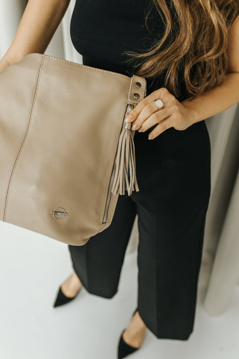 Torebka SABINE jest wyposażona w jedną pojemną komorę oraz pięć funkcjonalnych kieszeni, które pomagają w idealnym uporządkowaniu przechowywanych przedmiotów. Z tyłu torebki znajduje się płaska kieszeń zamykana na zamek, idealna na drobiazgi. W głównej komorze umieszczono dwie wsuwane kieszenie naszyte na podszewkę oraz jedną kieszeń zapinaną na zamek. Na froncie znajduje się dodatkowa kieszeń pionowa, zamykana na suwak, ozdobiona skórzanym chwostem – subtelny detal dodający jej charakteru.