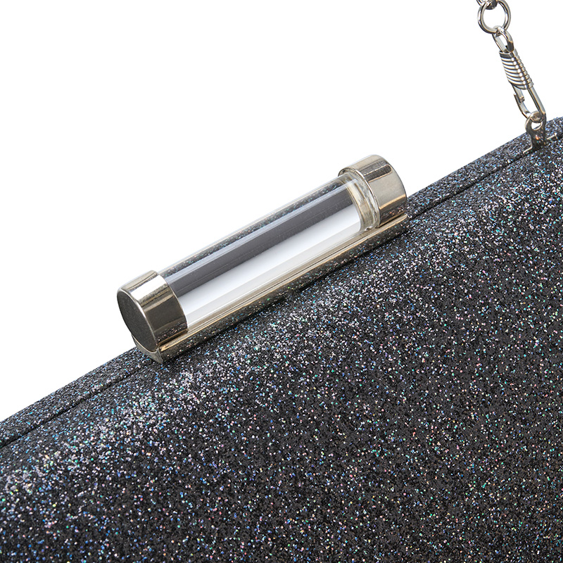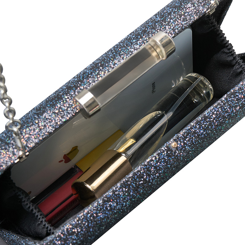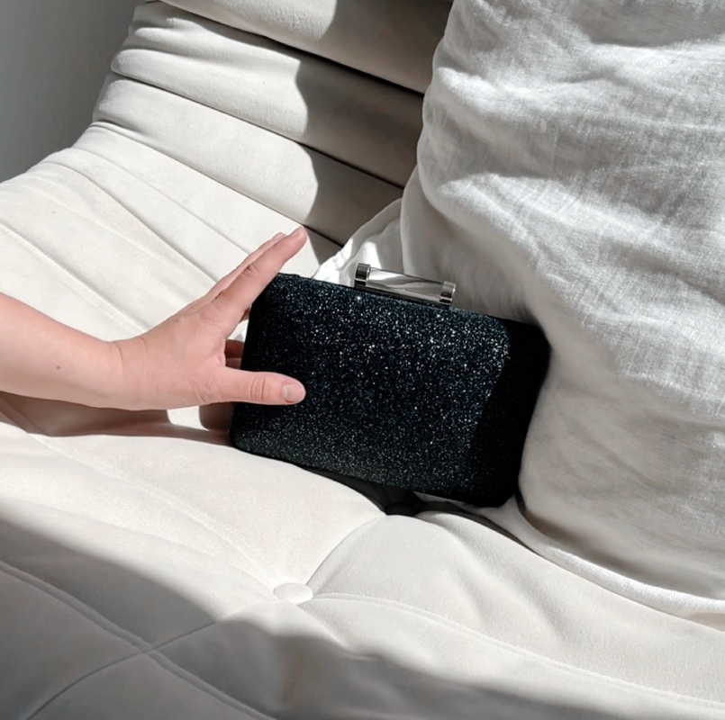 Faktura torebki pokryta jest delikatnym brokatem, który mieni się subtelnie w zależności od kąta padania światła. To doskonały dodatek do klasycznej „małej czarnej” jak i bardziej odważnych zestawów wieczorowych. Jednokomorowe wnętrze pomieści najpotrzebniejsze drobiazgi, a solidna obudowa torebki zadba o ich bezpieczeństwo.