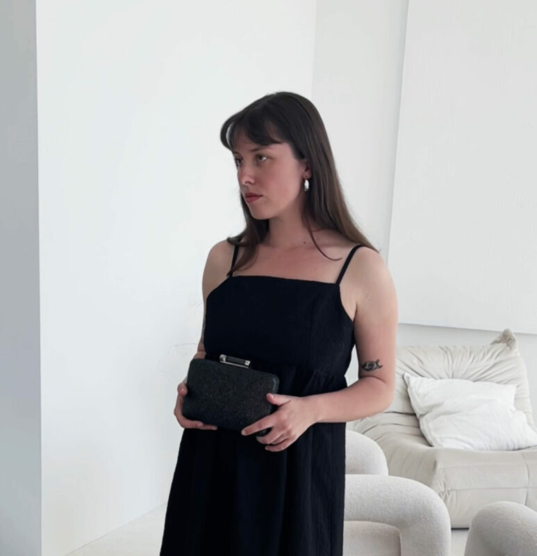 Pozioma forma i sztywna konstrukcja sprawiają, że torebka świetnie układa się w dłoni, zachowując przy tym swój kształt. Zapięcie na bigiel w formie efektownej tuby – przezroczystej, osadzonej w metalowej oprawie – dodaje całości luksusowego charakteru. Odpinany pasek-łańcuszek o długości 120 cm pozwala wygodnie nosić torebkę również na ramieniu.