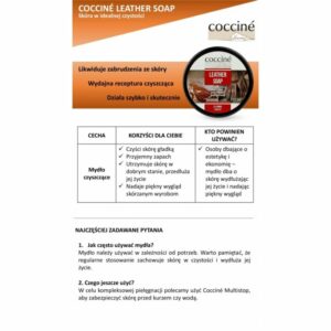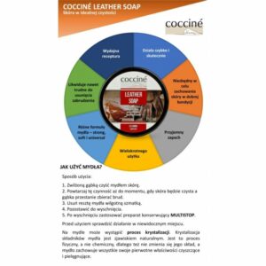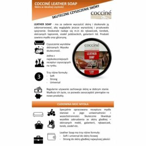 Mydło do skór LEATHER SOAP (strong formula) Cocciné to specjalistyczne mydło o wyjątkowo silnej, specjalnie opracowanej i wzmocnionej formule. Wyczyści skórę i przy regularnym stosowaniu doskonale ją zakonserwuje. Nadaje się do czyszczenia rękawiczek, toreb, skórzanych tapicerek oraz galanterii skórzanej. Skutecznie likwiduje wszelkie, trudne do usunięcia zabrudzenia z gładkiej skóry licowej.