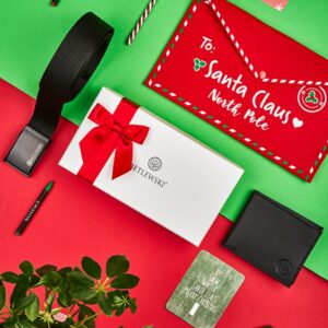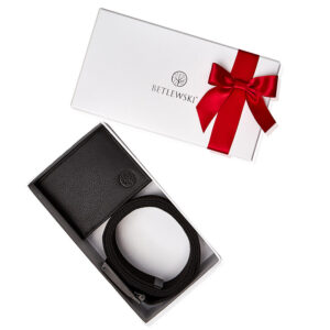Zestaw pasek i portfel są starannie zapakowane w białe pudełko prezentowe z logo marki BETLEWSKI® i ozdobione jest delikatną, czerwoną wstążeczką. Produkty wewnątrz pudełka są dodatkowo owinięte papierem. Całość jest już przygotowana do wręczenia, dzięki czemu zaoszczędzisz czas na szukanie odpowiedniego opakowania prezentowego. Oba dodatki idealnie się ze sobą komponują, nadając prezentowi elegancki charakter.
