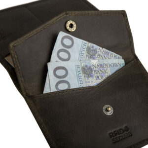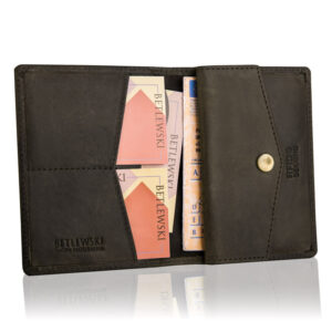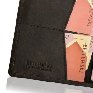 Bilonówka BETLEWSKI® została wykonana z jednego kawałka bawolej skóry naturalnej. Skóra ta jest dość surowa i cechuje się nieregularnymi przetarciami oraz barwą, co dodaje bilonówce charakteru. Z tyłu portfela także znajduje się tłoczenie marki. Bilonówka zapinana jest na mocny zatrzask w kolorze antycznego złota, który doskonale komponuje się z brązowym odcieniem skóry. Zapięcie jest solidne, dlatego nie musisz mieć obaw, że portfel sam się otworzy, a monety rozsypią.