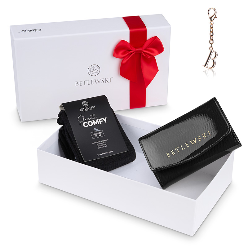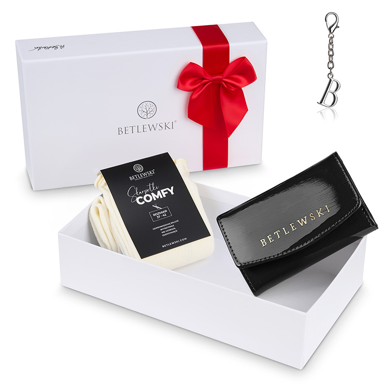 Klasyczny zestaw na prezent BETLEWSKI® to idealne połączenie stylu i praktyczności. Czarne etui z kolekcji ROYAL, wygodne skarpetki COMFY oraz złoty brelok tworzą komplet, który zachwyca estetyką i dbałością o każdy detal.