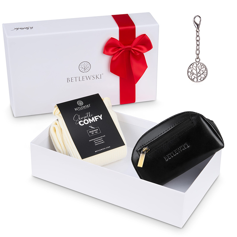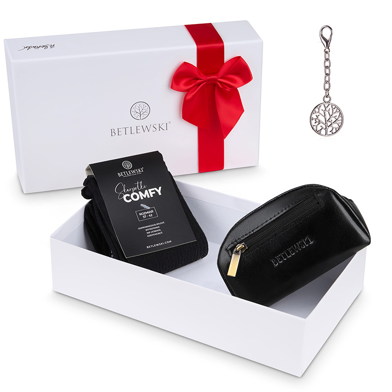 Ten klasyczny zestaw na prezent BETLEWSKI® to doskonały wybór dla kobiet, które lubią łączyć wygodę z klasą. Składa się z czarnego etui na klucze z kolekcji BIZNES, miękkich skarpetek COMFY oraz srebrnego breloka – razem tworzą idealny komplet codziennych akcesoriów.