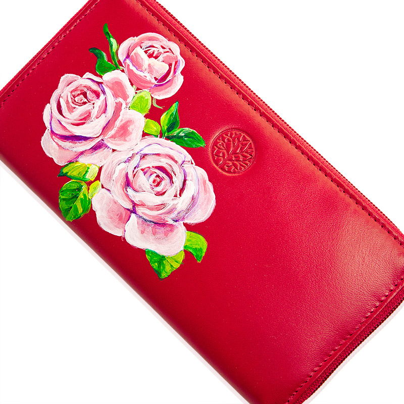 Wzór na tym ręcznie malowanym czerwonym portfelu damskim został wykonany z użyciem specjalnych farb do skór naturalnych z powłoką zabezpieczającą. Podobne farby używane są również do malowania, np. butów skórzanych. Farby te są bezwonne i niezwykle trwałe, co oznacza, że wzór nie będzie się ścierał ani łuszczył w trakcie użytkowania. Nie ulega uszkodzeniu w trakcie czyszczenia.