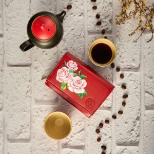 Ten czerwony portfel damski ręcznie malowany jest prawdziwą perełką wśród kobiecych akcesoriów. Wykonany z najwyższej jakości skóry naturalnej, zaprojektowany został z myślą o osobach, które cenią sobie elegancję, styl, oryginalność i unikatowe dodatki do swojej garderoby.
