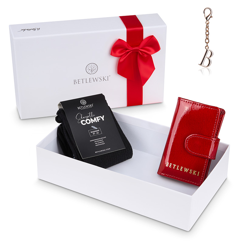Kobiecy zestaw prezentowy BETLEWSKI® to połączenie klasycznej elegancji i kobiecego temperamentu. Czerwone etui na klucze z kolekcji ROYAL, miękkie skarpetki COMFY oraz brelok z literką B tworzą komplet, który podkreśli styl każdej kobiety.